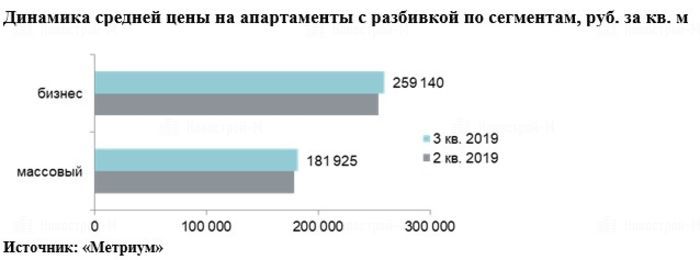 По подсчетам аналитиков «Метриум», в III квартале 2019 года на рынке апартаментов наблюдался рост средней цены в обоих сегментах. Так в комфорт-классе средневзвешенная цена увеличилась на 2,0% достигнув 181 925 руб., в бизнес-классе на 2,1% – до 259 140 руб. Причинами роста послужили структурные изменения в проектах и плановое повышение цен застройщиками.