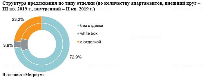 По типу отделки в общем объеме предложения преобладают апартаменты без отделки (72,9%). На лоты с готовым ремонтом приходится 23,2%. Около 4% составляют апартаменты с отделкой «white box».