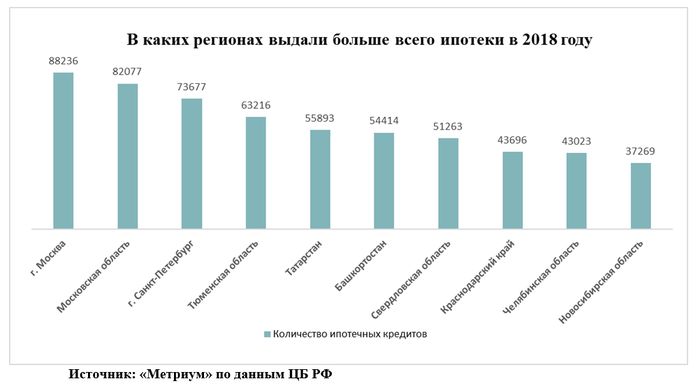 По подсчетам аналитиков «Метриум», 40% всех жилищных кредитов было выдано в 10 регионах России, лидирующих по число и объему ипотеки. Это Москва (88 тыс. ипотек), Московская область (82 тыс.), Санкт-Петербург (74 тыс.), Тюменская область (63 тыс.), Татарстан (56 тыс.), Башкортостан (54 тыс.), Свердловская область (51 тыс.), Краснодарский край (44 тыс.), Челябинская область (43 тыс.), Новосибирская область (37 тыс.). В денежном выражении в этих регионах россияне заняли в 2018 году 1,48 трлн рублей – 49% всех выданных в России ипотечных средств.