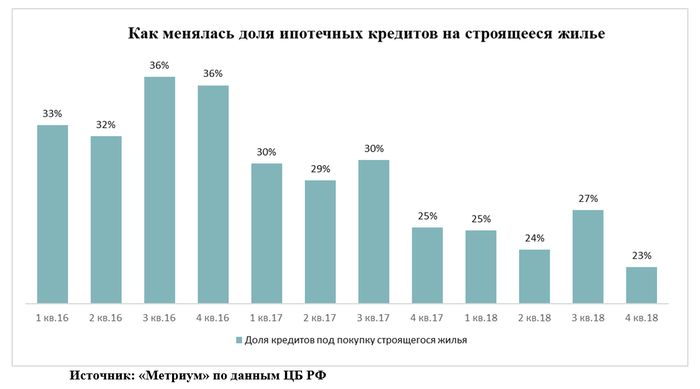 Чем ниже ставки по ипотеке, тем ниже спрос заемщиков на строящееся жилье, выяснили аналитики «Метриум». Повышение доступности ипотеки ведет к переориентации спроса на готовое жилье. В декабре 2018 года доля ипотечных кредитов, выданных для вложений в долевое строительство, достигла минимума за последние три года – 23%. Снижение средних ипотечных ставок коррелирует с уменьшением доли ипотечных сделок со строящимся жильем. В среднем в 2018 году она составила 25%, тогда как в 2017 году – 29%, а в 2016 году – 36%.
