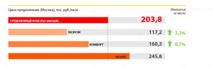 В экономклассе цены выросли наиболее заметно (+3,3%) по сравнению с показателями мая и составили 117,2 тыс. руб. за кв. м. В комфорт-классе цена за месяц прибавила 0,7% и составила 160,3 тыс. руб. В бизнес-классе по итогам июня зафиксировано снижение средней стоимости на 2,8% до 245,8 тыс. руб.