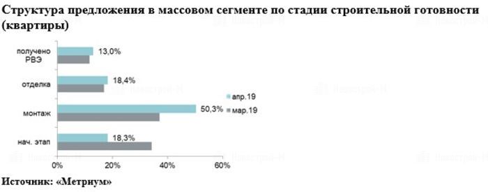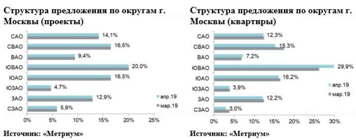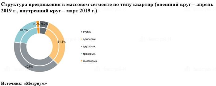 По данным «Метриум», на первичном рынке жилья массового сегмента Москвы в апреле 2019 года было представлено 85 жилых комплексов. Объем предложения составил около 16 395 квартир (953,6 тыс. кв. м). В сравнении с прошлым месяцем он сократился на 2,2% по количеству лотов и на 2% по реализуемой площади.