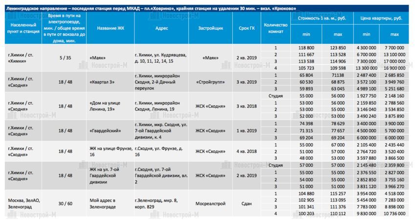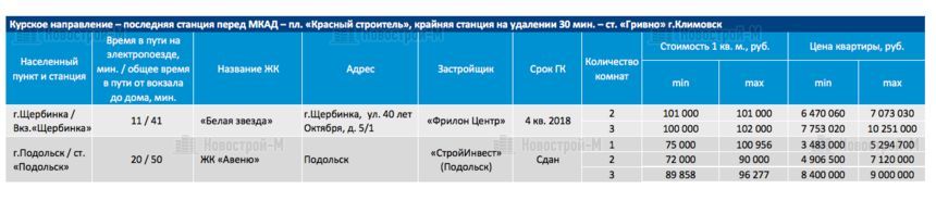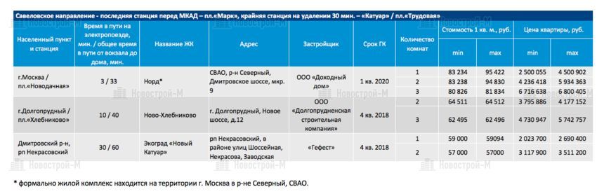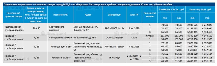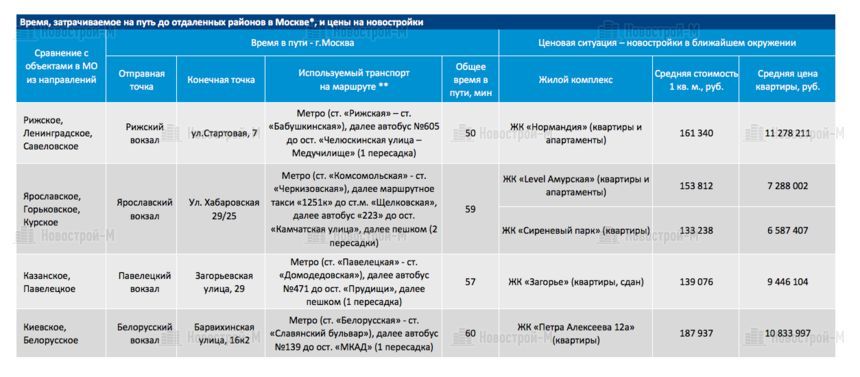 — при оценке времени в пути от станции непосредственно до дома рассматривались только те новостройки, которые максимально близко расположены к платформе (не более 1 км, что равно 10-12 минутам ходьбы), что позволяет их жителям свободно добираться до станции пешком. Очевидно, что в рамках данного анализа придется пренебречь возможным временем ожидания посадки в поезд непосредственно на станции отправления, но можно учитывать, что в часы пик поезда следуют с укороченными интервалами в 7-10 минут. Это, конечно же, несопоставимо с ритмичностью движения поездов метро, но близко к графику движения поездов МЦК;