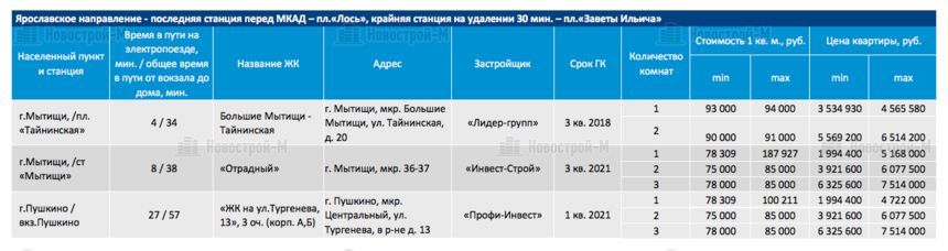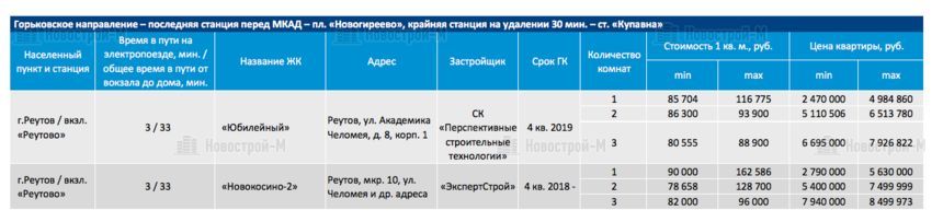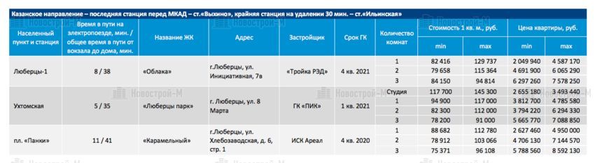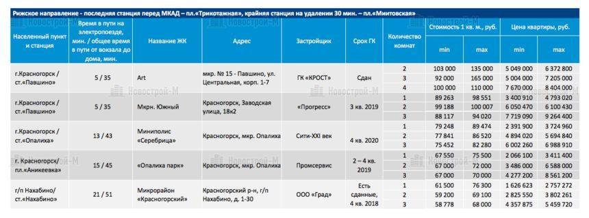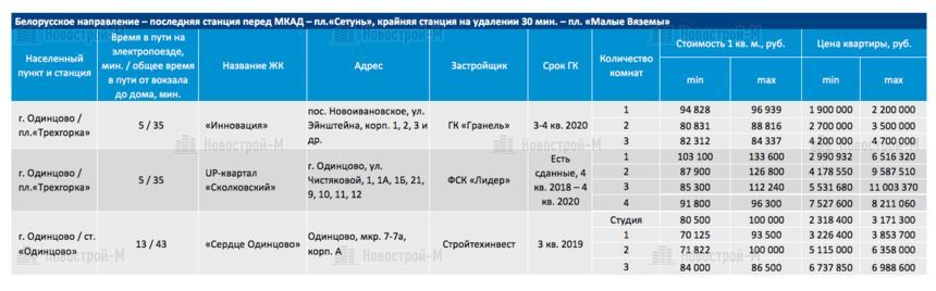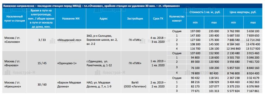 Обзор рынка показывает, что в настоящее время в ближайшем Подмосковье представлено минимум 35 объектов новостроек с большим выбором квартир различного типа, причем по всем железнодорожным направлениям. Исследование также показало, что до некоторых объектов новостроек в ближайшем Подмосковье можно добраться на общественном транспорте быстрее, чем до отдаленных районов Москвы, особенно это касается объектов, расположенных не далее 10-12 мин. движения на электричке от МКАД в Казанском и Павелецком направлениях (например, до города Видное), либо в Киевском и Белорусском направлениях (например, район Трехгорка города Одинцово);