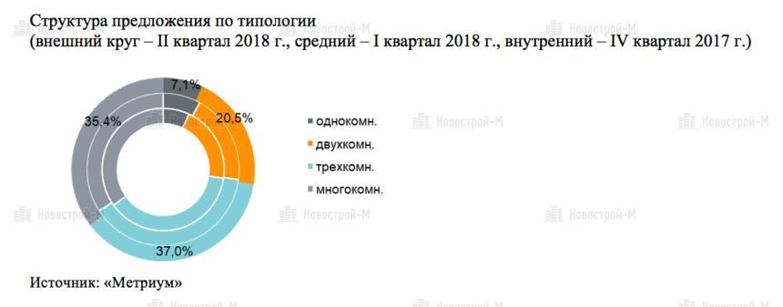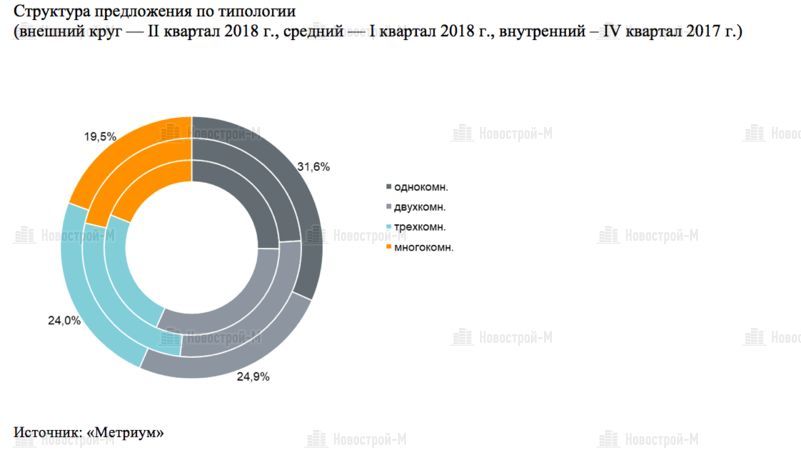 В конце II квартала 2018 года наибольший объем предложения в новостройках премиум-класса составили однокомнатные квартиры — 31,6% (+6,4 п. п.). Двухкомнатные и трехкомнатные лоты имели практически равные доли — 24,9% (-6,5 п. п.) и 24,0% (-0,4 п. п.) соответственно. Оставшуюся часть заняли многокомнатные — 19,5% (+0,6 п. п.).