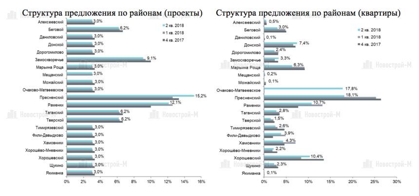 С начала года на рынок вышло четыре жилых комплекса в следующих районах: Мещанский, Раменки, Пресненский и Очаково-Матвеевское. Кроме того, началась реализация квартир в пятом квартале ЖК «Садовые кварталы» (девелопер — «Интеко») и корпусе R5 ЖК Prime Park (девелопер — Optima Development). При этом в одном из проектов (ЖК «Вишневый сад») закрытые продажи велись еще с конца 2016 года.