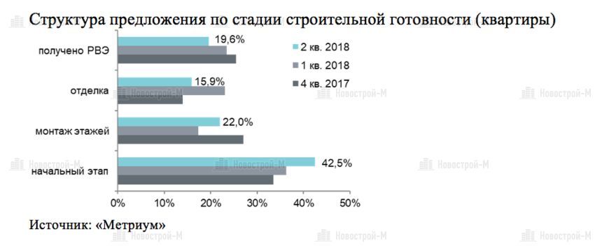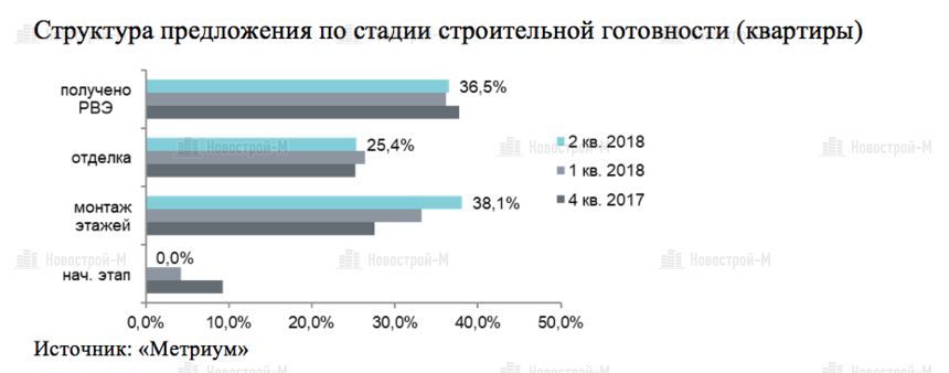 Более половины экспонируемых квартир сконцентрировано в домах на стадии монтажа этажей и в корпусах, уже введенных в эксплуатацию: 38,1% (+10,5 п. п.) и 36,5% (-1,3 п. п.) соответственно. На этап отделочных работ пришлось 25,4% (+0,1 п. п.). Предложение на начальной стадии строительства на текущий момент на рынке не представлено.