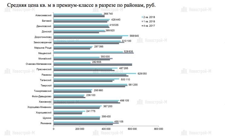 В разрезе по районам наиболее высокий показатель отмечен в районе Раменки — 629 050 руб. за кв. м (+10,4%). На втором месте расположился район Дорогомилово — 568 645 руб. за кв. м (+9,4%). Третье место занял Тверской район — 561 255 руб. за кв. м (+3%).