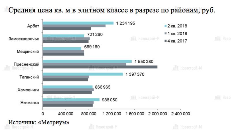 По подсчетам аналитиков «Метриум», средняя цена квадратного метра в элитном сегменте по итогам II квартала 2018 года составила 969 460 руб. В сравнении с концом прошлого года показатель вырос на 4,9% в рублевом и сократился на 2,4% в долларовом выражении, что объясняется ослаблением курса национальной валюты. За квартал динамика составила +5,8% и -4,8% соответственно.
