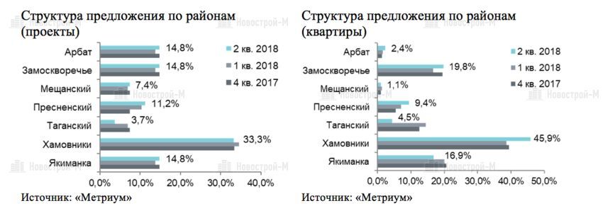 Как отмечают аналитики «Метриум», лидером по объему предложения остался район Хамовники. На конец отчетного периода на него пришлось 45,9% реализуемых лотов (+6,5 п. п. к 4 кв. 2017 г.) На втором и третьем местах — Замоскворечье (19,8%; +0,3 п. п.) и Якиманка (16,9%; -3,8 п. п.). Наиболее заметное снижение отмечено в Таганском районе (-8,1 п. п. до 4,5%), что было вызвано приостановкой продаж в ЖК «Клубный дом на Котельнической набережной».