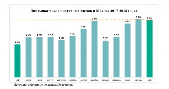 Тем не менее в годовом выражении рынок ипотеки в Москве продолжает демонстрировать беспрецедентно стремительный рост. По сравнению с прошлым маем число ипотечных сделок увеличилось на 73%, а за первые пять месяцев — на 82%. С начала года, подсчитали в «Метриум», для покупки жилья в столице привлекли 30,4 тыс. ипотечных кредитов, что составляет 56% от общего числа ипотек в 2017 году.