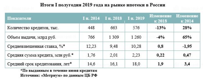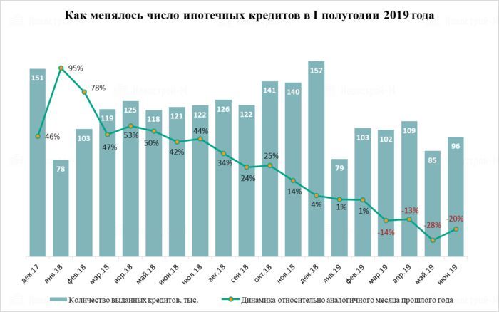 С января по июнь российские банки выдали населению 576 тыс. кредитов на сумму 1,26 трлн рублей. По сравнению с первой половиной прошлого года, россияне заняли на 13% меньше кредитов, а сумма заимствований сократилась на 4%. Полугодовые показатели ипотечного рынка ушли в минус впервые с 2015 года, за которым последовали три года непрерывного роста (2016-2018).