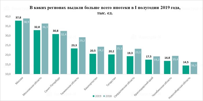 За первое полугодие 2019 года 41% всех ипотечных кредитов был выдан в десяти регионах-лидерах по количеству жилищных займов. Ни за полгода, ни за год состав топ-10 субъектов Российской Федерации в этом отношении не поменялся. Больше всего кредитов на покупку жилья в I полугодии заняли в Москве (37,8 тыс.), Московской области (32,8 тыс.), Санкт-Петербурге (30,8 тыс.), Тюменской области (23,3 тыс.), Башкортостане (20,5 тыс.), Татарстане (20,2 тыс.), Свердловской области (19,3 тыс.), Краснодарском крае (17,5 тыс.), Челябинской области (16,8 тыс.) и Новосибирской области (14,5 тыс.).