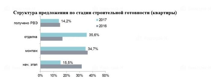 К концу года наибольшая часть квартир была сосредоточена в объектах на стадии отделочных работ (35,6%). За отчетный период их доля выросла на 18,7 п.п. Более трети лотов (34,7%, -1,6 п.п.) было представлено в новостройках на этапе монтажа этажей. Объем предложения в корпусах на начальной стадии строительной готовности и домах, введенных в эксплуатацию, был сопоставим – 15,5% и 14,2% соответственно. Причем доля первых за год значительно снизилась – на 16,2 п.п.