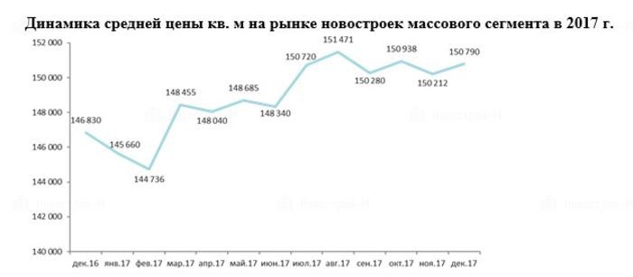 Динамика средней цены кв. м на рынке новостроек массового сегмента в 2017 г.