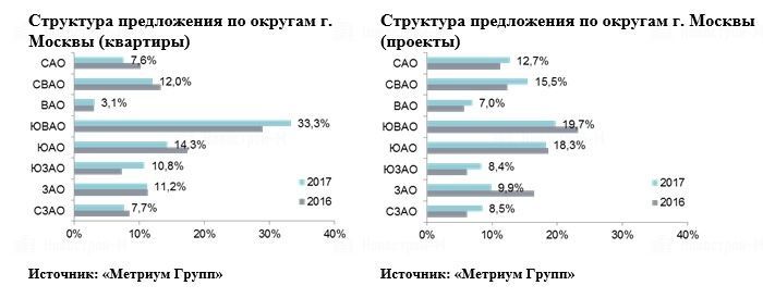 Как отмечают аналитики «Метриум Групп», в структуре предложения по административным округам не произошло существенных изменений. По-прежнему лидером является ЮВАО (33,3%). За год доля округа увеличилась на 4,3 п.п. Вторая позиция сохранена за ЮАО (14,3%, -3 п.п.). Наименьшая доля предложения традиционно сосредоточена в ВАО (3,1%, +0,1 п.п.).