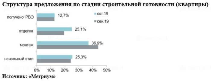 В октябре благодаря новым проектам и корпусам увеличилась доля предложения на начальной стадии строительной готовности (+1,1 п.п., 25,3%). Наибольшая часть квартир по-прежнему сосредоточена в корпусах на этапе монтажа этажей, однако за месяц она сократилась на 6,8% (до 36,9%). Четверть рынка находится в объектах на стадии отделочных работ (+5,6%). Практически не изменился объем предложения в готовых домах (+0,1 п.п., 12,7%).