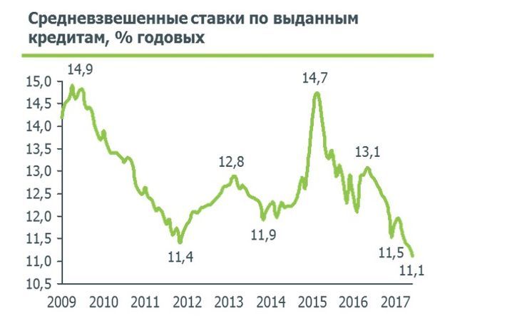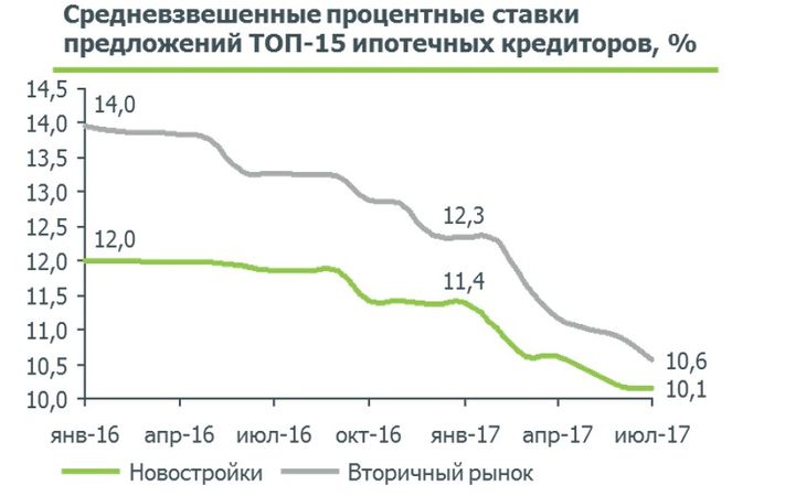 В июне 2017 года средневзвешенные ставки выдачи по ипотеке достигли уровня в 11,1%, в том числе - на первичном рынке – 10,7%, на вторичном рынке – 11,3%. Снижение с начала года составило 0,7 п.п., по сравнению с 01.07.2016 – более 1,8 п.п. В июле АИЖК впервые в истории установило однозначную (9,75%) процентную ставку для широкого круга рыночных заемщиков.