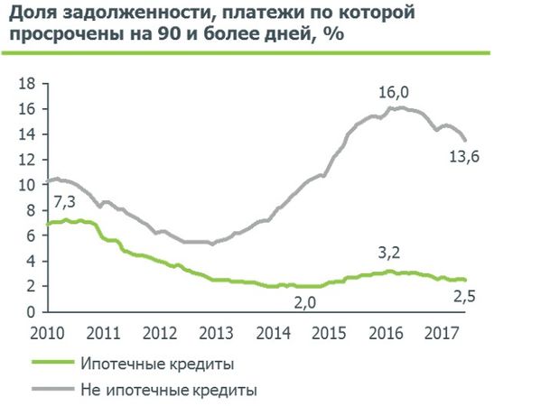 Текущее состояние ипотечного рынка характеризуется высоким качеством портфеля и низким уровнем просроченной задолженности. Доля просроченной ипотечной задолженности свыше 90 дней на 1 июня 2017 года составляет 2,5%. Еще год назад доля «дефолтных» кредитов составляла более 3% портфеля.