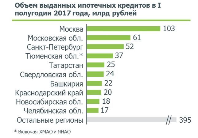 На долю 10 регионов-лидеров приходится 49% всего объема выдачи ипотеки. В этих регионах сконцентрированы и основные объемы жилищного строительства: 53% всего строящегося многоквартирного жилья и 47% введенных в эксплуатацию многоквартирных домов в I полугодии 2017 г.