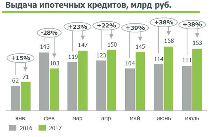 По оценкам АИЖК, в июле рост продолжился - выдано около 155 млрд руб. (+38%). На протяжении 5 месяцев темпы роста превышают 20%.