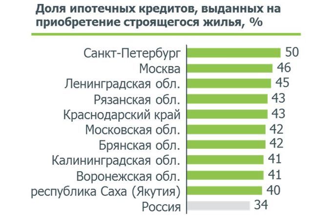 На приобретение строящегося жилья в среднем по России выдается 34% всей суммы ипотечных кредитов. При этом в 10 регионах-лидерах эта доля превышает 40%. В этих регионах ипотечное кредитование оказывает большее влияние на развитие строительной отрасли и, за счет мультиплицирующего эффекта, стимулирует экономический рост в регионе.
