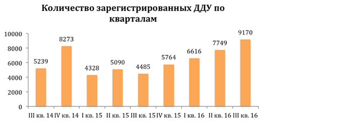 В общей сложности в январе-сентябре 2016 года Росреестром в Москве было зарегистрировано 23 535 ДДУ. Это на 69,3% больше, чем за тот же период 2015 года. Более того, этот показатель на 19,7% превысил количество ДДУ, заключенных за весь прошлый год.