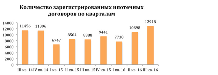 При этом доля ипотечных сделок растет не столь стремительными темпами, как количество заключаемых ДДУ. В сентябре Росреестр зарегистрировал 3 500 ипотек. Это на 25,1% меньше, чем в августе текущего года. Если же рассматривать весь третий квартал, то и в сегменте ипотеки можно отметить рекорд. За этот период было зарегистрировано 12 819 сделок, что на 54% больше, чем за третий квартал прошлого года. Положительная динамика относительно второго квартала оказалась такой же, как и с ДДУ – 18,5%. Прошлый же рекорд был поставлен в третьем квартале 2014 года – 11 456 сделок. Таким образом итоги квартала текущего года оказались лучше на 12,8%. Всего в январе-сентябре 2016 года Росреестром было зарегистрировано 31 546 ипотечных сделок. Это на треть больше, чем за этот же период прошлого года.