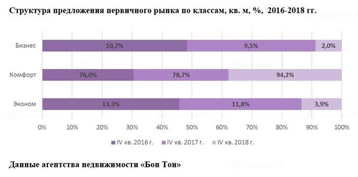 Согласно статистике агентства недвижимости «Бон Тон», активный выход в реализацию проектов комфорт-класса повлиял на классовую структуру предложения. По сравнению с 4 кварталом 2017 года на рынке Новой Москвы произошли существенные изменения. Доля комфорт-класса увеличилась на 15,5%, составив 94,2%, в то время как другие сегменты продемонстрировали сокращение. Доля бизнес-класса снизилась на 7,5% (до 2%) в связи с отсутствием нового предложения, экономкласса — на 7,9% (до 3,9%).