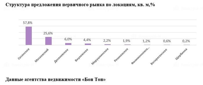 На территории НАО большая доля предложения сосредоточена в поселениях Сосенское (57,8%) и Московский (25,6%). Минимальные доли (от 0,2% до 0,6%) зафиксированы на территории Щербинки и пос. Воскресенское.