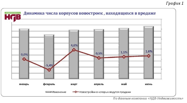 - В июне, несмотря на начавшийся период отпусков, показатели деловой активности на рынке новостроек Москвы увеличились. Так, в первый летний месяц на рынок вышли как новые проекты, так и дополнительные объемы в уже реализуемых объектах. Таким образом, увеличение объема предложения в июне составило 1,1%.