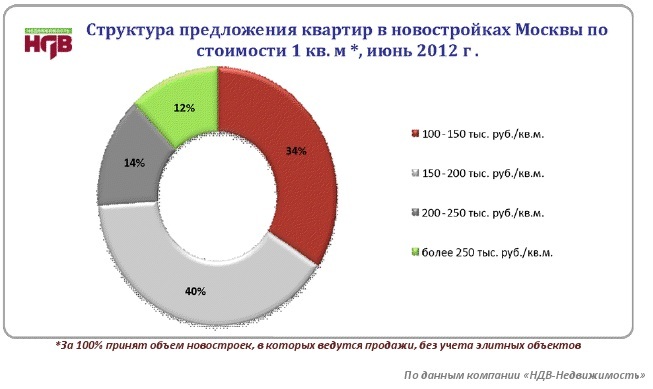 В июне в структуре предложения новостроек по стоимости кв. м не произошло существенных изменений. Несмотря на выход в продажу новых проектов на низкой стадии готовности, корпусов со средней стоимостью кв. м ниже 100 000 руб. за кв. м на рынке не появилось. Аналитиками компании «НДВ-Недвижимость» отмечено несколько предложений многокомнатных квартир в домах на низкой стадии готовности со стоимостью кв. м в диапазоне от 90 000 до 100 000 руб.