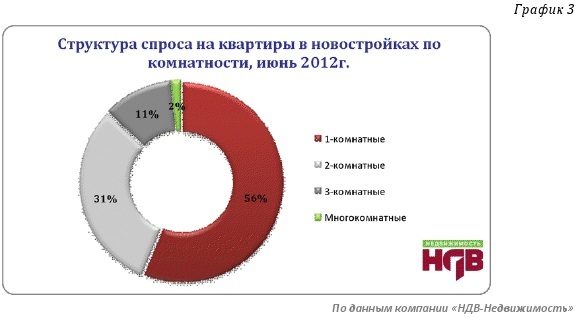 Общая структура спроса в июне осталась без существенных изменений. По-прежнему, наибольшим спросом среди покупателей пользуются однокомнатные квартиры, относительно мая показатель увеличился на 4%. По 2% потеряли показатели заинтересованности покупателей в приобретении двух- и трехкомнатных квартир, их доля в общей структуре спроса составляет порядка 42%. Доля многокомнатных квартир в общей структуре спроса по комнатности не превышает 2%.