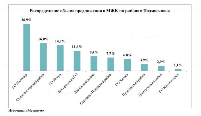 Больше всего малоэтажных новостроек, сдающихся в 2018 году, представлено в городском округе Истра — четыре проекта. При этом по объему предложения данная локация занимает лишь третью позицию с показателем 14,7% от всего объема квартир в рассматриваемом сегменте. В лидерах же находится городской округ Мытищи, где сосредоточено 26,9% предложения. В частности, здесь реализуется жилой комплекс «Катуар», удачно расположенный рядом с тремя водохранилищами — Икшинским, Пестовским и Пяловским.