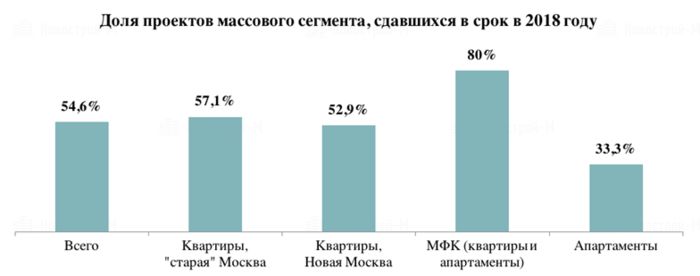 Ситуация на столичном рынке первичного жилья сильно ухудшилась по сравнению с 2017 годом: тогда в срок были сданы 62,5% новостроек эконом- и комфорт-класса. По итогам 2018 года лишь в 55% проектах строящегося жилья, которые были заявлены к сдаче в конце 2018 года, сроки не были перенесены, подсчитали аналитики компании «Метриум». Застройщики остальных 45% новостроек Москвы не справились с задачей – сдать жилье вовремя - и вынуждены были продлить сроки реализации проектов.