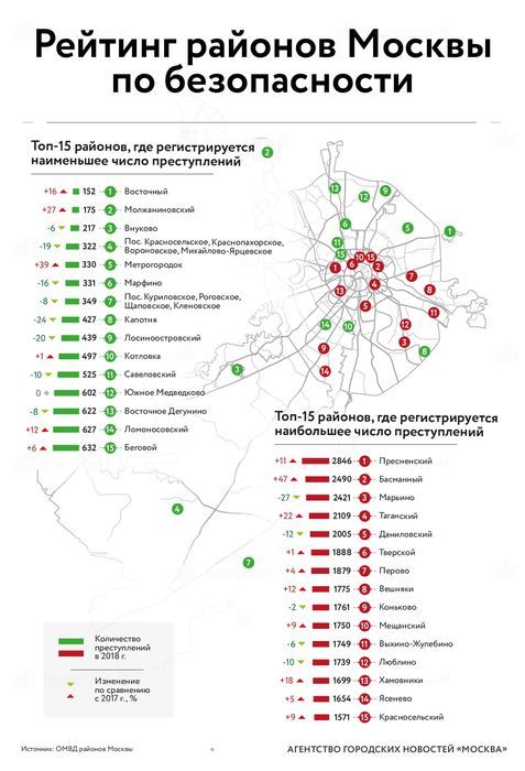 Лидерами рейтинга самых безопасных районов стали Восточный – там в 2018 году зарегистрировано всего 152 преступления, Молжаниновский с показателем 175 преступлений за год и Внуково – здесь, по данным МВД, в этом году было совершено 217 преступлений.