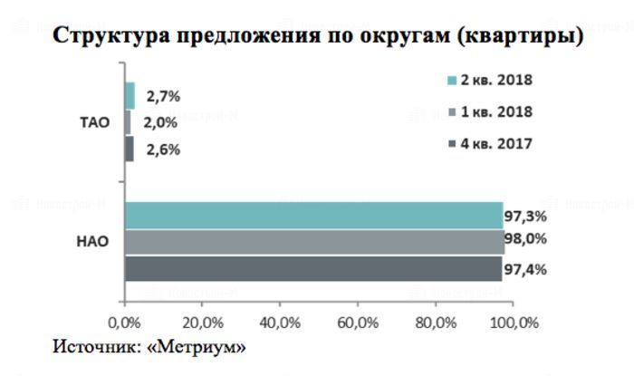 Наибольшая доля квартир в продаже приходится на Новомосковский административный округ — 97,3% (- 0,1 п. п.). В ТАО, соответственно, реализуется 2,7% (+0,1 п. п.) предложения.