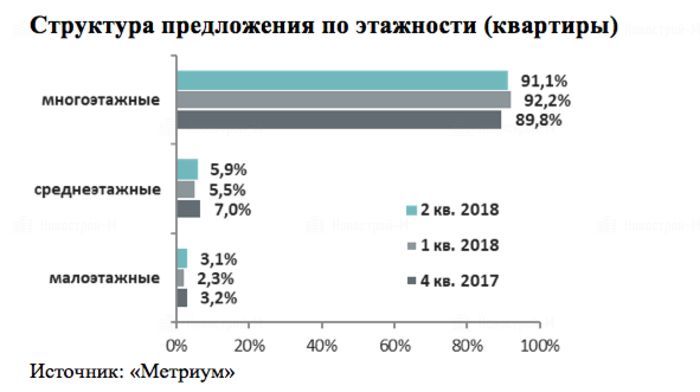 За полугодие произошло увеличение доли предложения в многоэтажных объектах. В июне она достигла 91,1% (+1,3 п. п.). На лоты в средне- и малоэтажных корпусах пришлось 5,9% (-1,1 п. п.) и 3,1% (-0,1 п. п.) соответственно.