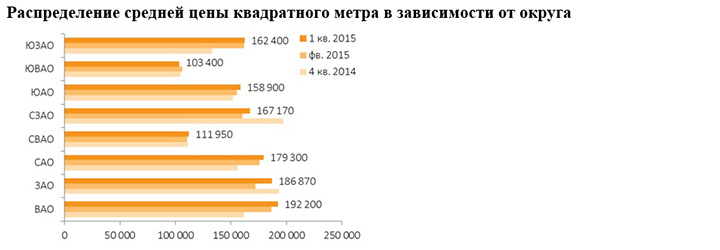 За квартал средняя цена квадратного метра выросла более чем на 7% и достигла 157 960 руб. Наиболее активно повышались цены в январе 2015 года, а уже в феврале рост практически остановился. Также на увеличение ценового уровня повлияло решение застройщиков снять с продажи в марте часть квартир в низкобюджетных проектах.