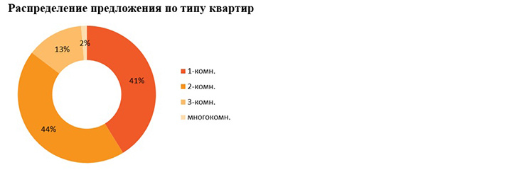 Распределение предложения по типологии не претерпело значительных изменений: 44% приходится на двухкомнатные квартиры, еще 41% – на однокомнатные.