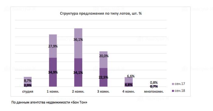 В структуре предложения по типу лотов наблюдается паритет однокомнатных и двухкомнатных квартир (34,9% и 34,1%, соответственно). Доля студий сократилась до 2,9%, при этом однокомнатных вариантов стало больше (+7%).