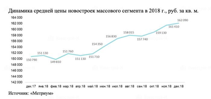 По подсчетам аналитиков «Метриум», в декабре 2018 года средняя цена квадратного метра на рынке новостроек массового сегмента составила 162 090 руб. За декабрь показатель увеличился на 0,4%, а за год – на 7,5%. Причем положительная динамика отмечалась почти весь 2018 год, за исключением отдельных месяцев, когда средний уровень цен снижался из-за поступления в продажу новых комплексов и квартир по стартовым ценам. Самый низкий уровень цен был зафиксирован в феврале – 149 810 руб. за кв. м (на 0,6% ниже декабря 2017 г.), а максимальное значение пришлось на декабрь.