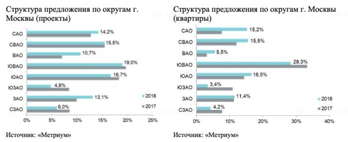 Эксперты «Метриум» отметили изменения в структуре предложения массовых новостроек по административным округам. Доля лидера (ЮВАО) уменьшилась на 5 процентных пунктов (до 28,3%). Одновременно увеличилась на 2,4 п. п. (до 16,5%) доля округа, занимающего вторую позицию (ЮАО). На третьей строчке расположился СВАО (15,5%, +3,5 п. п.). На четвертом месте с минимальным отрывом САО (15,2%, +7,6 п. п.). Наименьшая доля предложения сосредоточена в ЮЗАО (3,4%, -7,4 п. п.).