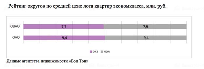 Средневзвешенная цена в экономклассе составляет 125,2 тыс. рублей за кв. м. Объемы предложения распределяются между ЮВАО и ЮАО. Самым дорогим округом является ЮАО. Средневзвешенная цена квадратного метра находится на уровне 160,9 тыс. руб., что можно объяснить наличием предложения с предчистовой и полной отделкой в проектах на заключительной стадии строительной готовности. Средняя цена лота — 9,4 млн руб.