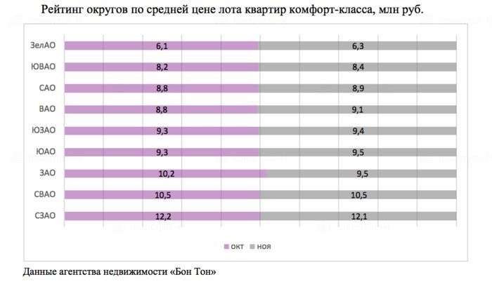 Согласно статистике «Бон Тон» за ноябрь, средняя стоимость квартир в массовом сегменте составила 9,45 млн рублей, учитывались новостройки в старых границах Москвы. Средневзвешенная цена квадратного метра находится на уровне 155,5 тыс. рублей.