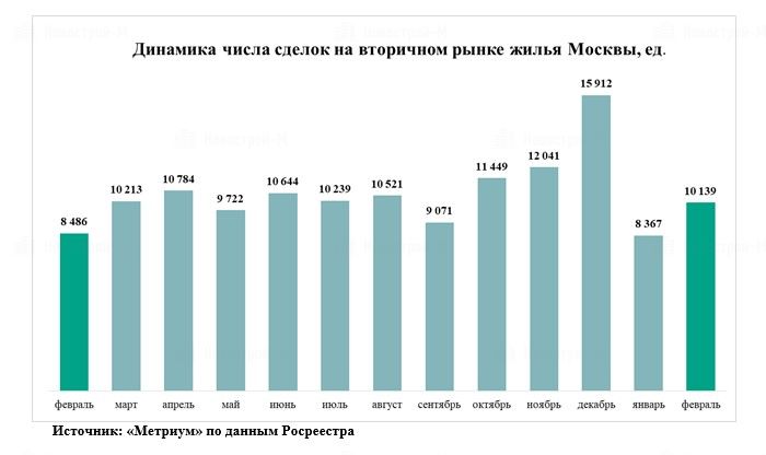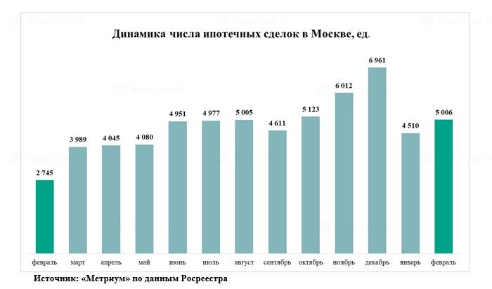 Февральские продажи квартир в строящихся жилых комплексах Москвы почти в два раза превысили показатели за тот же месяц прошлого года, достигнув 5,6 тыс. договоров долевого участия (ДДУ). Эксперты компании «Метриум» отмечают, что в феврале было заключено больше сделок, чем во все месяцы 2017 года, кроме самых активных – ноября и декабря. Схожую динамику продемонстрировал ипотечный спрос, который увеличился на 82%. Также закрепилась тенденция к восстановлению вторичного рынка, где количество сделок выросло на 20%.