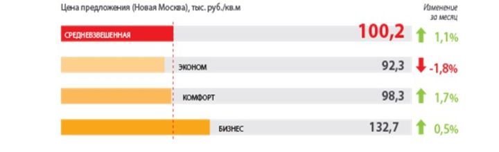 Также стоит обратить внимание и на достаточно активное снижение объемов предложения бизнес-класса. Месячное изменение составило более 1,1 п.п. Данное перераспределение отразилась и на средневзвешенной цене «старой» Москвы, которое обновило многолетний ценовой минимум.