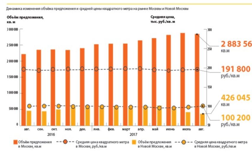 «В целом, в августе 2017 г. продолжилась тенденция предыдущего месяца с относительно низкой девелоперской активностью. В «старой» Москве на рынок вышло всего 3 проекта и примерно 20 корпусов в уже реализуемых ЖК. Таким образом, на фоне относительно высокого спроса в августе 2017.г было зафиксировано впервые за 10 месяцев хоть и незначительное (0,3%), но все же сокращение объемов предложения. Однако следует учесть, что, несмотря на первое сокращение объемов предложения в 2017 г., все же велика вероятность дальнейшего возобновления роста данного показателя на фоне осенней активизации девелоперов. При сохранении темпов прироста, характерных для последних месяцев, планка в 3 млн кв. м будет преодолена еще до конца года.