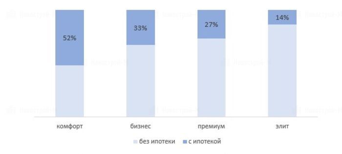 По итогам первого полугодия 2019 года доля сделок с ипотекой в комфорт-классе составила 52% благодаря доступности ипотечных кредитов и снижению процентных ставок. В бизнес-классе 33% сделок проведены с ипотекой, в премиум-классе – 27%, в элит-классе – 14%. Сложившаяся ситуация объясняет высокую зависимость сегмента недвижимости «комфорт» от сделок с привлечением ипотеки, в то время как рынок элит-класса мало чувствителен к ипотечной ставке.