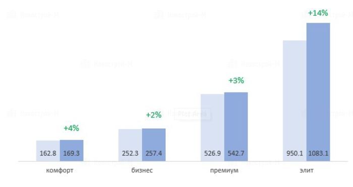 Что касается средней цены квадратного метра, то по итогам второго квартала 2019 года по сравнению со вторым кварталом 2018 года наблюдается рост во всех сегментах новостроек. Так, в комфорт-классе средняя стоимость квадратного метра увеличилась на 4% и составила 169,3 тыс. рублей, в бизнес-классе – на 2% и установилась на уровне 257,4 тыс. рублей, в премиум-классе – на 3% с ценой в 542,7 тыс. рублей, сегмент «элит» со средней стоимостью 1083,1 тыс. рублей показал повышение показателя на 14%.